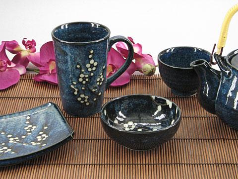 Blue Plum Japanese porcelain bowl. Smooth deep blue glaze with beautiful blue plum design. 8 oz. mug and 4 oz. bowl (4.5" dia). Sold individually. Made in Japan. Mug is sold out.
