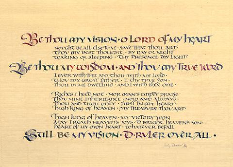 The initials beginning each paragraph have small design elements inspired by the Lindesfarne Gospels. The text, part of Irish monastic tradition since 700 CE., is an example of a Lorica, an incantation recited for protection in arming oneself for spiritual or physical battle. It has become a popular song performed by contemporary Christian musicians.