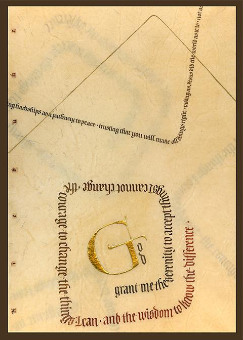 The text is written on two surfaces; vellum (calf skin) shows its beautiful transparency placed over the Arches Text Wove. Lettering on the vellum was done with gouache after pouncing and rubbing finely ground gum sandarac onto the vellum to help it accept the gouache and give clean, crisp lines. The initial āGā was done with 23IK patent gold over gum ammoniac."