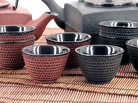 Cast iron set of 4 teacups. 2 oz. capacity. Black enameled interior with matte brown or black finish. Hand wash. Made in China.
