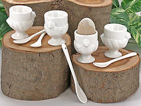 Lovely porcelain egg cups in the shape of a chicken and matching porcelain spoons to serve hard or soft boiled eggs in style. Set includes 4 cups and 4 spoons.