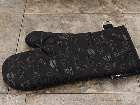 Black oven mitt is embellished with a silicone design for a non-slip grip. 100% cotton fabric. Silicone coating. Machine washable.