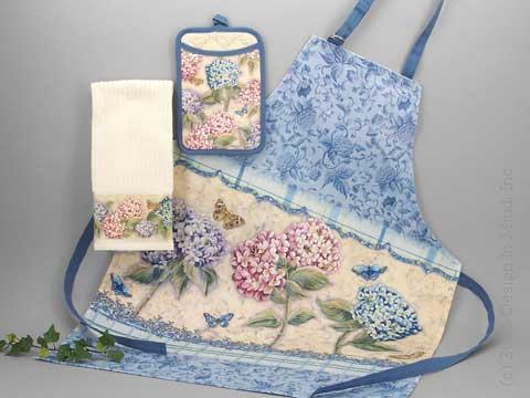 Hydrangeas items include a 16 x 26 inch terry pantry towel, pocket oven mitt, and woven poly apron.