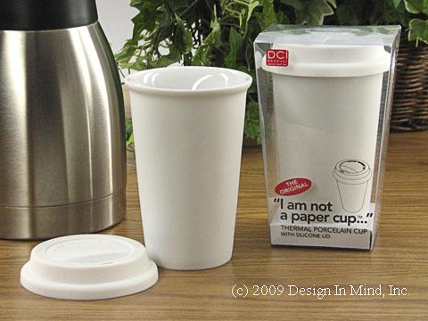 "I am not a paper cup"™ thermal porcelain cup with silicone lid. Two layers of porcelain separated by a hollow cavity act as a perfect insulator for hot and cold beverages and ensures that you won't burn your fingers. Holds approximately 10 oz. 6" tall. Microwave and dishwasher safe. Cleaning instructions for lid included. Made in China.