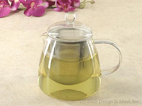 24 oz glass tea pot for hot or iced tea by Hario. Glass pot with glass lid. Includes a large deep removable stainless steel mesh infuser basket. 4.75" base dia. x 6"h. Made in Japan.