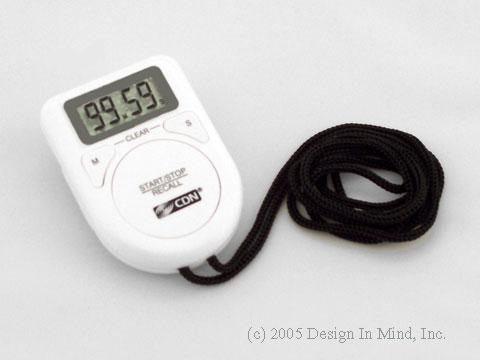Counts 100 minutes by seconds. Automatic recall of last time counted down. Counts up and down. 3-way holder: rope, pocket clip, and magnet. White. 1 5/8" w x 2 1/4" h. Battery included.