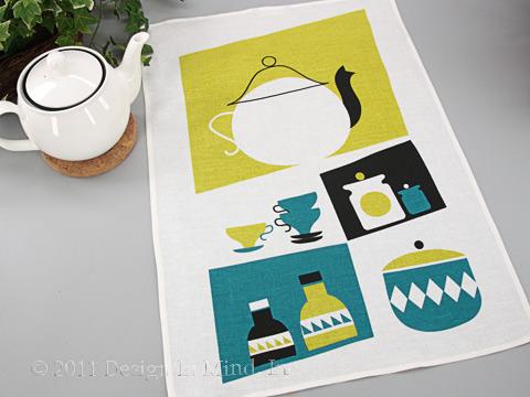 Swedish linen towel from Spira. Kitchen theme in turquoise, chartreuse and black on an ivory background. Made of 100% linen. Known for softness & absorbency that increases with each washing. 25" x 18". Fully hemmed. Machine wash and dry. Made in Sweden.