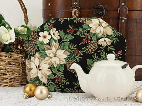 Poinsettias in shades of cream and tan, dark red berries, brown pine cones and cool green leaves and pine sprigs delicately highlighted with metallic gold cover a black background. Shown with our Chatsford teapot in cream.