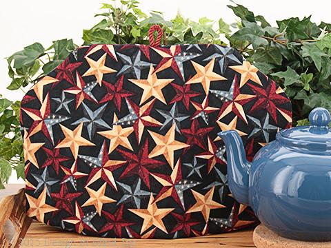 Barn stars in deep red, medium blue and antique light tan cover a soft black background on this tea cozy. Quilter's cotton. Shown with our Brown Betty teapot in French Blue.