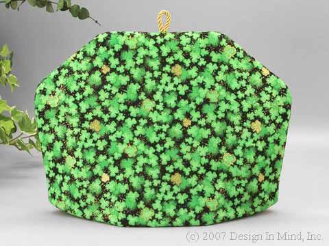 Bright green three-leaf clovers on a black quilter's cotton with metallic gold accents.