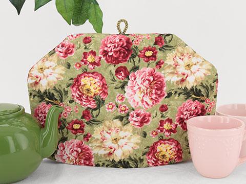 A profusion of flowers in raspberry, pink, cream and yellow cover the softly mottled background of this refreshing tea cozy. Quilter's cotton fabric. Shown with Brown Betty teapot in leaf green, sold separately.