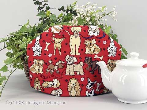 Perky pooches ready to romp cover this bright red tea cozy. Can't you just feel their anticipation and energy? Red quilters cotton with tan, cream, brown, white & black dogs.