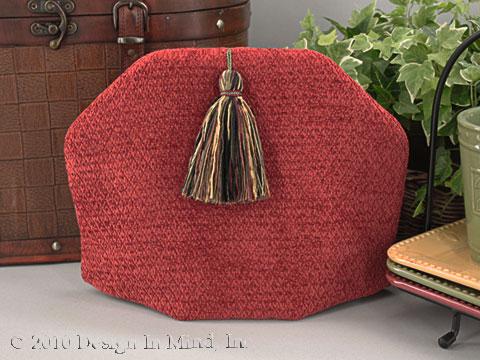 Deep brick red chenille with a very subtle diamond pattern. Accented with a multicolored tassel. Very rich.