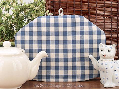 For a classic look, you can't beat this limited edition gingham checked tea cozy in ivory and blue. Shown with Chatsford teapot in cream and small cat teapot from a private collection.