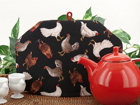 Chickens in white, browns and red mingle on a black quilter's cotton tea cozy. Shown with the Curve teapot in red and our chicken egg cups.