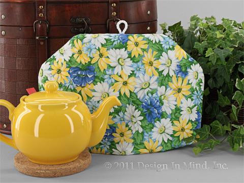 This bright tea cozy features yellow, white, royal blue and light blue daisies surrounded by variegated green leaves. Quilters cotton fabric.