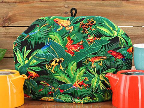 Brilliantly colored tree frogs leap and climb on the tropical foliage of this tea cozy. Quilters cotton fabric.