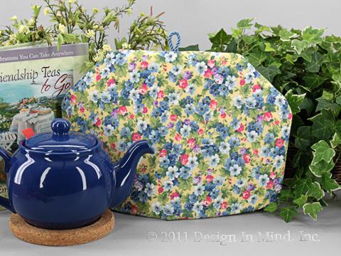 This tea cozy has a soft yellow background with Forget Me Nots in shades of blue, rosy pink, and purple all surrounded by green leaves. Quilters weight cotton fabric.