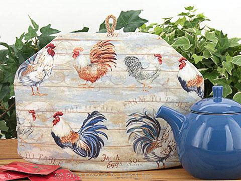 A variety of chicken breeds pose against a backdrop of distressed painted boards, along with retro style advertising script, on this fun tea cozy. Shades of blue, teal, brown, taupe, red and soft black. Coordinates with our Feather Frenzy tea cozy. Shown with Curve teapot in marine.