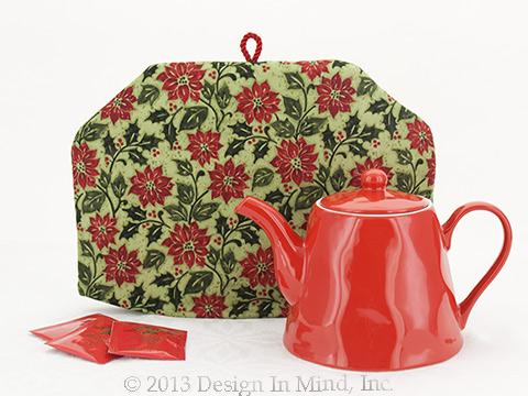 This holiday tea cozy is a beautiful batik-style print of holly and poinsettias. Light and dark moss greens and poinsettia reds on a softly speckled background. Shown with Krinkle teapot in red.