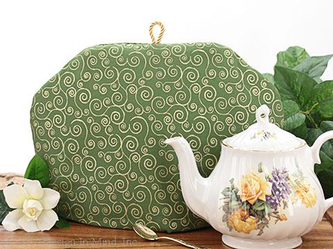 Softly shimmering gold swirls take this olive green tea cozy from simple to casually elegant. Quilters cotton. Teapot from a private collection.