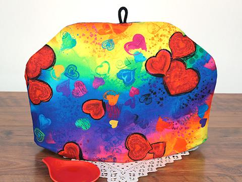 Your valentine will love this tea cozy covered with bright audacious hearts and rainbow splashes of color. The fabric is a quilters cotton. Shown with a 45 ounce Curve teapot in red.