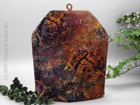 This cotton batik tea or coffee cozy is covered in warm brown, orange, and purple hues. The batik pattern appears to form a deep woods scene.
