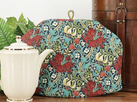 Reminiscent of Arts and Crafts movement floral wallpapers, this rich tea cozy features creamy white lilies, deep red, turquoise to teal and leaf green, with very subtle metallic gold highlights on a deep blue background. Quilters cotton fabric. Shown with teapot from a private collection.