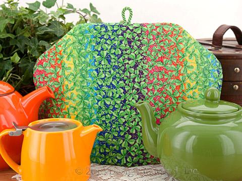 A shower of bright green shamrocks are falling in front of a vibrant rainbow, accented by a fine mist of metallic silver on this quilter's cotton tea cozy. Perfect for your St. Patrick's Day pot of tea! Shown with Curve teapot in carrot, Stump teapot in mandarin and Brown Betty teapot in leaf green.