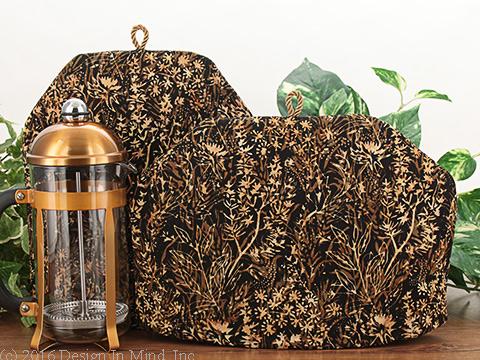 This tea cozy is crafted from a cotton batik fabric with rich copper, brown and warm cream colored meadow flowers on a black background. Shown with Bonjour Maximus press in copper.
