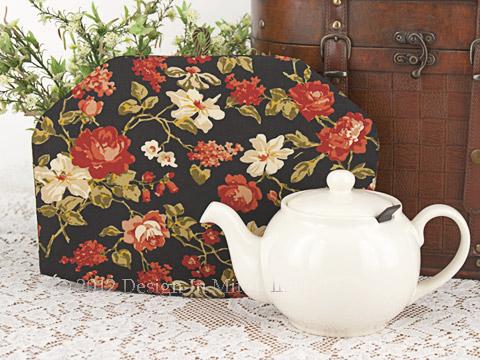 Roses in rich red, rose and cream cover variegated green vines on this rich black tea cozy. Quilter's weight cotton fabric.