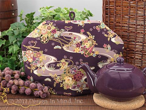 This tea cozy is a rich plum quilters cotton with a parade of instruments and flowers on a journey. Plum, deep raspberry and green are accented with yellow, blue and white, all edged in metallic gold for a touch of elegance and richness.
