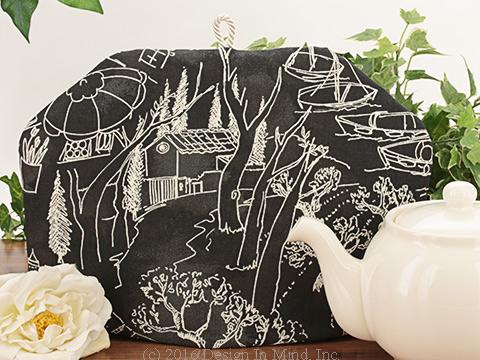 The mottled slate grey background of this charming tea cozy is sketched with varied scenes of mountains, vineyards, sidewalk cafes and boats in harbor. perhaps it reminds you of a favorite travel destination? Heavyweight cotton blend. Pattern will vary. Shown with our Chatsford teapot in cream.