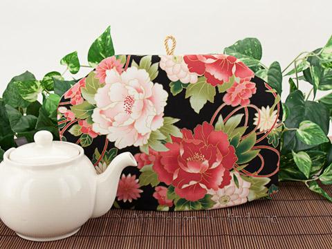 Lush peonies in shades of pink, maroon and white with green leaves and loose pink bows cover this black quilters cotton tea cozy. Metallic gold highlights. Shown with Chatsford teapot in cream.
