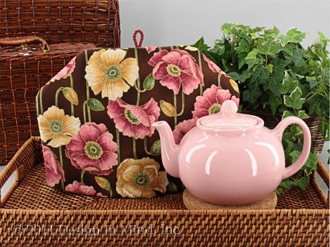 This tea cozy features Poppies in shades of rose and golden yellow with variegated green and yellow stems and buds. Accented with metallic gold edging on a rich brown background. Quilters weight cotton fabric.