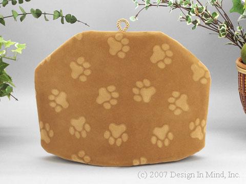 Cute paw prints on a short napped "velvety feel" camel colored upholstery fabric.