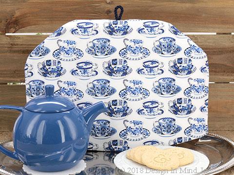 This cozy reminds us of Russian Lomonsov teaware with its blue and white cups and saucers with gold gilded edges. White quilter's cotton. Very pretty.