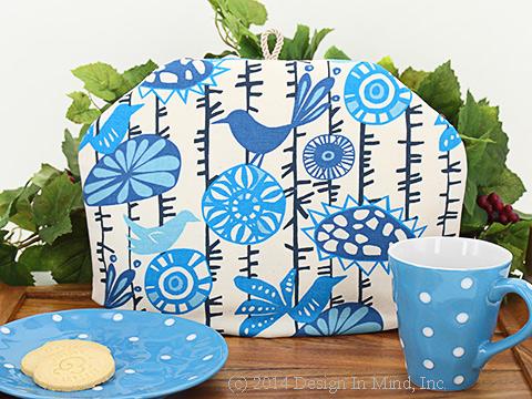 A fresh view of flowers and birds makes a fun tea cozy in shades of blue, turquoise and cream. Decorator cotton fabric in a natural color with tiny flecks. Shown with Sprinkle teaware in Sky polka dot.