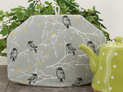 Sweet sketchy little birds congregate amid white branches with chartreuse buds and leaves on a soft grey tea cozy. Quilters cotton fabric.