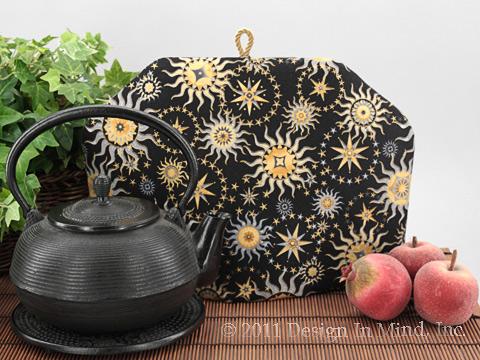 Whimsical stars shine on this tea cozy in shades of yellow, gray and metallic gold on a black quilter's cotton fabric.