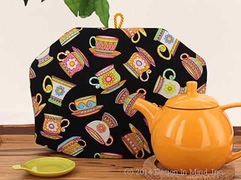 This tea cozy has brightly colored teacups dancing on a black background. Quilters cotton. Shown with Forlife Curve teapot in mandarin and tea tidy in lime.