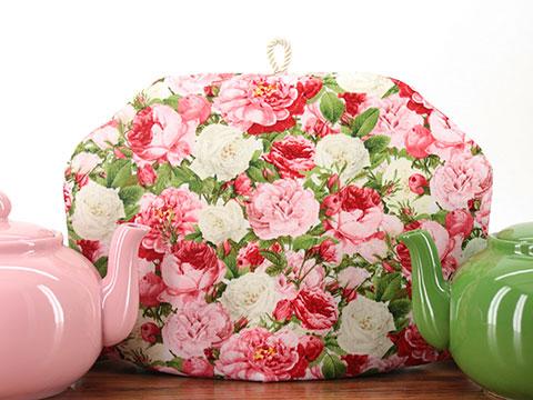 A profusion of vivid pink and soft cream roses cover this quilter's cotton tea cozy. Shown with Brown Betty teapot in leaf green and rosy pink.
