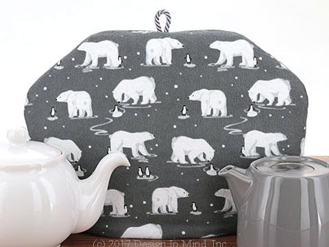 Polar bears and penguins on a dark pewter grey background cover this soft flannel tea cozy. We created this cozy as a nod to our neighbor city of White Bear Lake and their city mascot. Shown with Chatsford teapot in white and Stump teapot in gray.