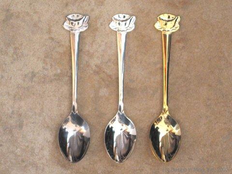 Demi-spoon with a teacup handle ornament. Finished in stainless, silverplate, or goldplate (left to right).