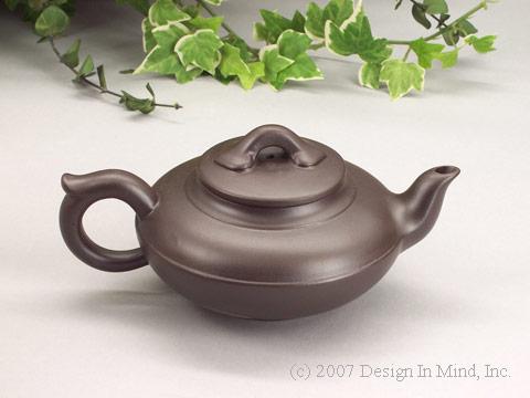 This personal size Yixing teapot is deep brown and includes an internal strainer. 7"w x 3"h x 4.5"d. Holds 10 oz.