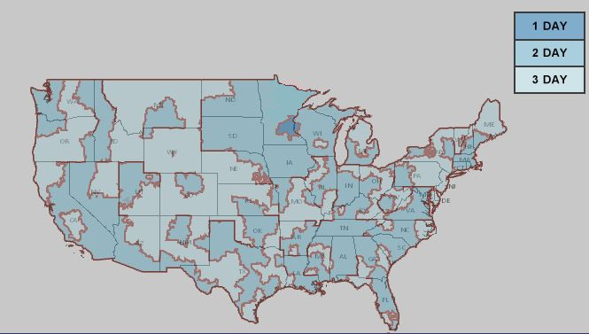 Delivered 1-5 days after shipment. Surcharges are added for residential delivery. Surcharges are also applied for rural or extended rural delivery. See UPS.com for more information. Quoted rates include our fees for packing/handling. See the service map below for estimated delivery times after shipment: