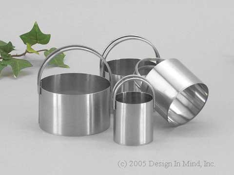 Tall stainless steel biscuit cutters with double handles and crisp edges in 1 1/2, 2 1/8, 2 3/8, and 2 3/4 inch diameters.