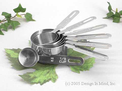 Stainless steel professional weight measuring cups with long handles. 1/8, 1/4, 1/3, 1/2, 2/3, 3/4, and 1 cup sizes.