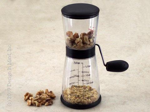 The Nut Chopper & Grinder is cleaverly made to produce 2 grinds. Turn the handle one direction for coarse chop, turn the other direction for fine grind. Non-slip bottom grips the counter and measurements on cup sides clearly show the amount of ground or chopped nuts. The chopper is made of ABS, Stainless Steel and Sanoprene and is for right or left handed use. 8"h x 3 3/8" dia. less handle. 1 1/3 cup capacity. Dishwasher safe.