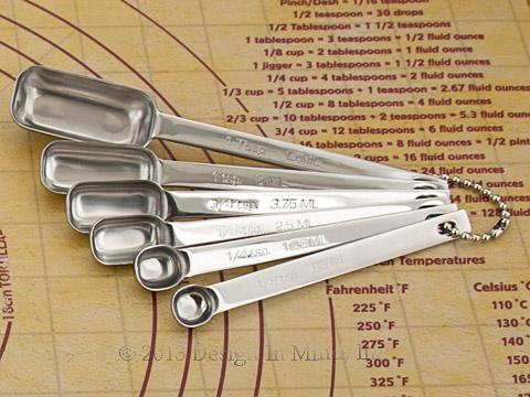 Stainless steel professional weight measuring spoons with long handles and long rectangular bowls to fit in spice tins easily. 1/8, 1/4, 1/2, 3/4, and 1 teaspoon; 1 tablespoon sizes.